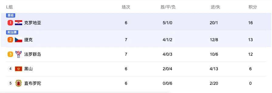 本场比赛后,少赛一场的克罗地亚队积16分排名L组第一位,捷克队7战积13分,法罗群岛队7战积12分紧随其后。根据规则,小组第一名将直接获得世界杯正赛资格,第二位将可以参加预选赛附加赛。