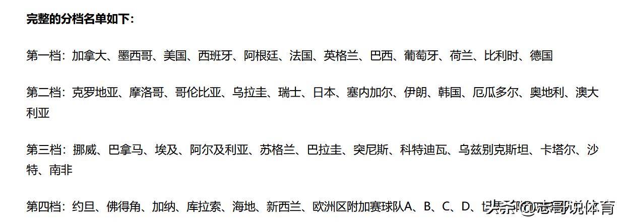 完整的抽签结果如图所示。根据赛程安排,小组赛将于明年6月11日开始,至6月27日结束;淘汰赛阶段随即开始,决赛定于7月19日举行。比赛时间将跨越一个多月。对于中国球迷来说,由于时差的缘故,观看比赛相对更为友好,至少不用熬夜观看了。返回搜狐,查看更多