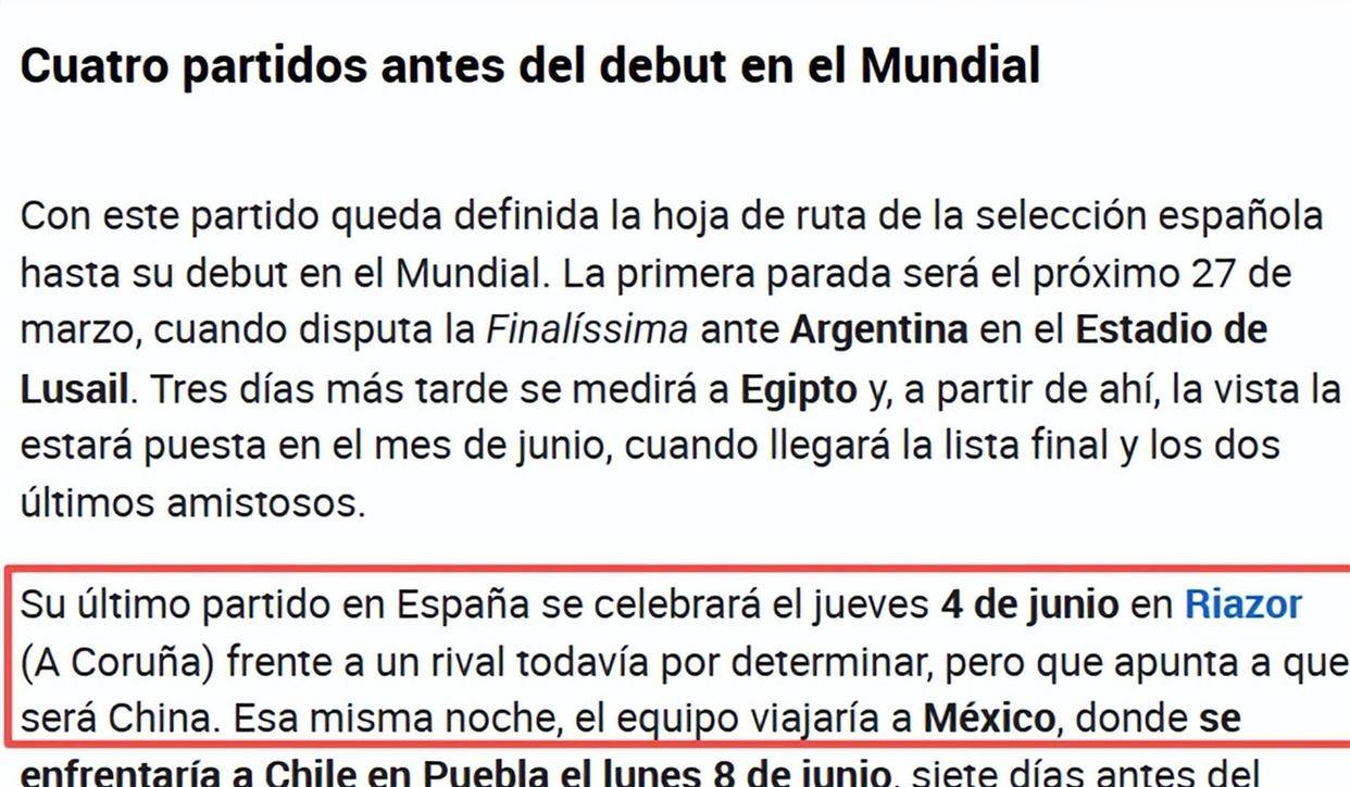 报道里写得挺具体。 西班牙队今年6月的行程排得很满,他们有两场热身赛要踢。 第一场定在6月4日,地点是西班牙拉科鲁尼亚的里亚索球场,对手还没最后确定。 第二场在6月8日,地点远在墨西哥的普埃布拉,对手是南美劲旅智利队。 而那个待定的6月4日的对手,《马卡报》直接点了中国男足的名字。