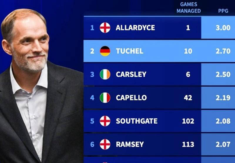 图赫尔带领球队参加的10场比赛中(含8场预选赛和2场友谊赛),仅在友谊赛中客场输给塞内加尔一役中丢球,其余均告捷,场均拿下2.7分,仅次于因丑闻辞职的前名帅阿勒代斯。值得一提的是,他的前任卡斯利同样战绩不俗,位列历史第三,后面还有如卡佩罗和索斯盖特等知名教练。正是凭借着这样稳健的成绩,英足总迅速与图赫尔达成续约共识。
