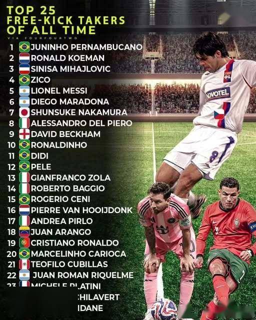 从第11到第25位的球员,同样是足球史上的任意球传奇。迪迪作为“落叶球”的鼻祖,用精准的脚法影响了一代又一代的球员;贝利和马拉多纳一样,用充满力量和激情的任意球,征服了世界足坛;吉安弗兰科·佐拉和罗伯托·巴乔,则用优雅的技术和精准的脚法,成为了意大利足球的代表;罗杰里奥·切尼和何塞·路易斯·奇拉维特,则用门将的身份,重新定义了任意球的可能性;皮埃尔·范霍伊东克、安德烈亚·皮尔洛、胡安·阿兰戈、梅罗时代的另一位代表人物克里斯蒂亚诺·罗纳尔多、马塞利尼奥·卡里奥卡、特奥菲洛·库比利亚斯、胡安·罗曼·里克尔梅、米歇尔·普拉蒂尼和齐内丁·齐达内,也都用自己独特的任意球技术,在足球史上留下了浓墨重彩的一笔。这些球员的任意球,不仅仅是得分的手段,更是足球艺术的体现。他们用脚法和智慧,在足球场上创造了无数的经典时刻,让球迷感受到了足球的极致魅力。无论是儒尼尼奥的“电梯球”,还是贝克汉姆的“圆月弯刀”,这些任意球都将永远铭刻在足球史上,成为后人学习和模仿的对象,欢迎在评论区留下你的看法,一起来讨论下。